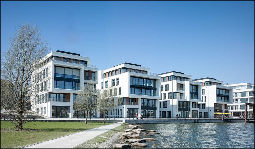 Das aus vier Baukörpern bestehende und mit einer Tiefgarage verbundene Büro- und Geschäftshaus PIER 4 bereichert durch sein maritimes Erscheinungsbild die städtebauliche Qualität der Uferpromenade am PHOENIX See.